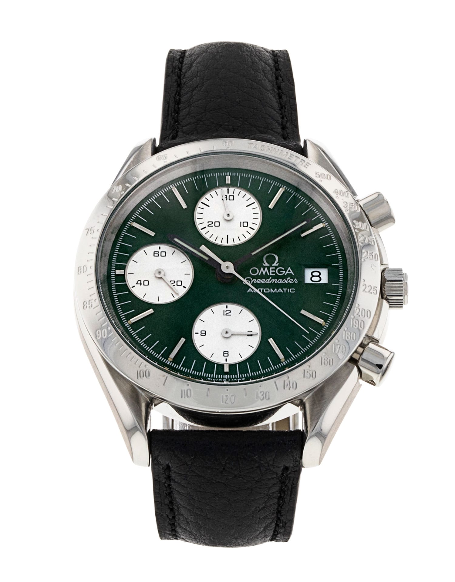 This Omega Speedmaster Automatic Date 3811.70.26 has a green dial and a leather strap. This Omega has undergone a thorough inspection of accuracy, functionality and condition at our Omega certified service centre to determine the level of reconditioning required to meet our strict standards. It has also been checked against our records to ensure authenticity. All our watches have a 24-month warranty for your peace of mind.